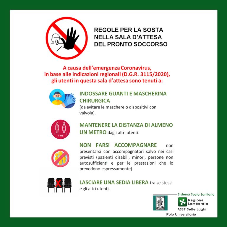 «Il decreto del 13 ottobre stabilisce esplicitamente: «E' fatto divieto agli accompagnatori dei pazienti di permanere nella sale di attesa dei dipartimenti emergenze e accettazione dei pronto soccorso (DEA/PS)...». Si rinnova dunque l'invito ad allontanarsi prima possibile. Tale prescrizione vale ovviamente per tutti i presidi ospedalieri dotati di pronto soccorso» si legge in una nota di Asst Sette Laghi.