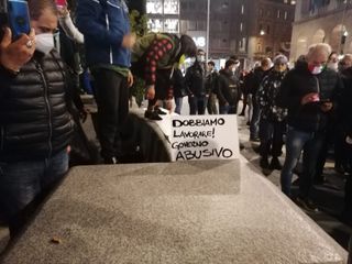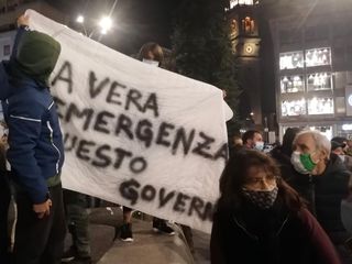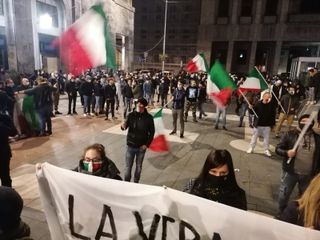 «Sarebbe bastato cercare il contatto con il popolo che sta riempiendo le piazze di tutta Italia, anche se i telegiornali difficilmente ve lo dicono - ha aggiunto ancora, dal megafono, l'organizzatore Francesco Tomasella (video in basso) - Vi dicono che due esagitati spaccano una vetrina ma non vi dicono che si stanno riempiendo le piazze di centinaia di capoluoghi: se migliaia, anzi milioni di persone scendono in strada è perché la gente ha paura di morire di fame. Se questo virus fosse così mortale come ci raccontano, non sareste tutti qui con noi. La gente chiude attività per cui ha lavorato tutta la vita, in questo Stato che è il più tassato al mondo. Noi chiediamo libertà, lavoro e dignità».