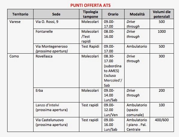 Di seguito si riporta la tabella riassuntiva dell’offerta dei punti tamponi messi a disposizione da Ats Insubria: