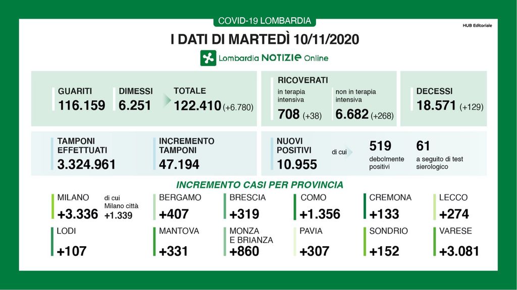 Ecco il quadro completo dei dati di oggi, martedì 10 novembre, in Lombardia e il dettaglio provincia per provincia. Leggi invece QUI i dati nazionali
