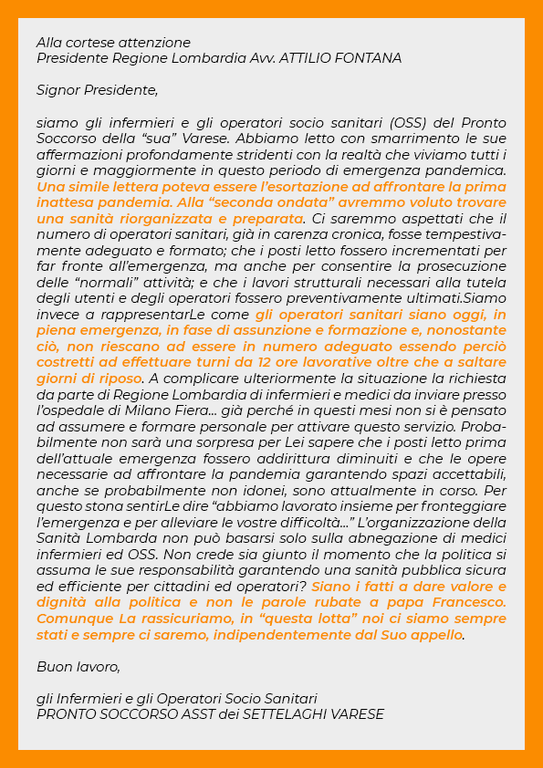 Poche parole, ma incisive. Con una lettera indirizzata al Presidente Fontana, gli infermieri e gli operatori socio sanitari di Varese denunciano la situazione di emergenza in cui sono costretti ad operare: sotto organico, in costante riorganizzazione e con turni di 12 ore senza giorni di riposo.