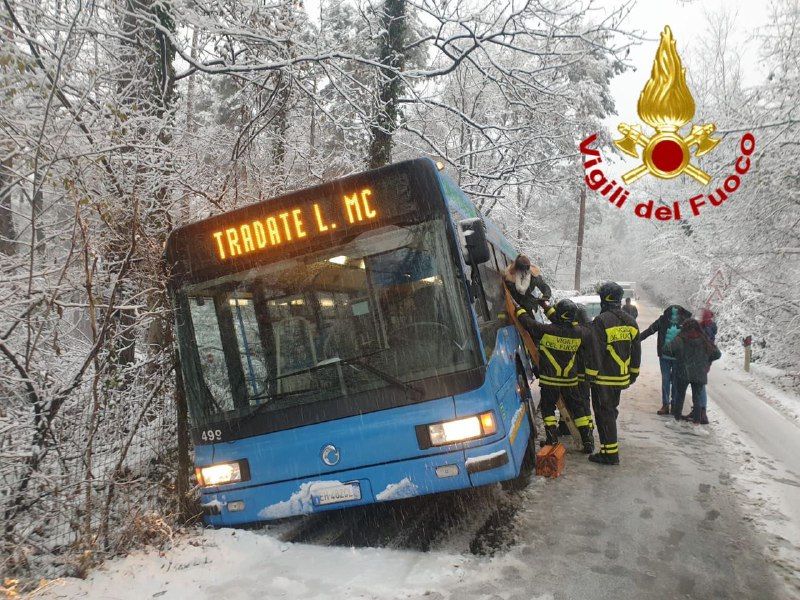Nevica senza sosta in tutto il Varesotto. In città la coltre bianca ha superato in alcuni punti i dieci centimetri di accumulo. Continuano i disagi sulle strade e per la caduta di rami appesantiti dalla neve: decine gli interventi dei vigili del fuoco su tutto il territorio provinciale. A Tradate in via Castelnuovo un autobus è finito parzialmente fuori dalla sede stradale, i passeggeri sono rimasti bloccati all’interno. I vigili del fuoco hanno rotto uno dei finestrini e fatto uscire le persone con l’ausilio di una scala.