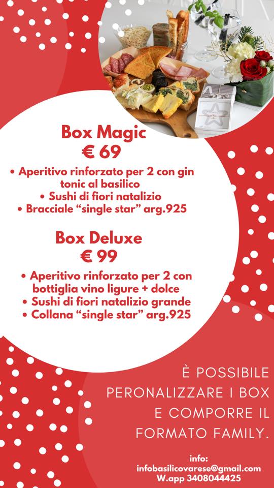 - BOX DELUXE, contenente l’aperitivo rinforzato per 2 persone con bottiglia di vino ligure e dolce; un “Sushi” di fiori natalizio grande; una collana “single star” arg. 925 I “Christmas Box” sono personalizzabili, con la possibilità di comporre il formato family.