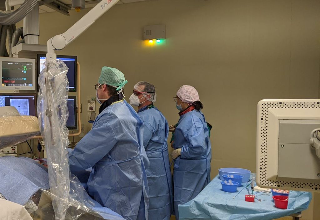 L’intervento simultaneo su tutti e tre i pazienti è stato possibile grazie alla disponibilità organizzativa di Radiologi ed Emodinamisti. Questi ultimi, in particolare, hanno immediatamente messo a disposizione la propria sala angiografica, in aggiunta a quelle di pertinenza della Radiologia e Neuroradiologia.