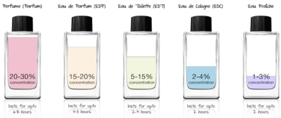 In realtà esistono cinque diversi tipi di profumo, non solo EDT ed EDP, i più comuni e conosciuti di cui abbiamo parlato sopra. La storia è meravigliosamente “complicata” e puoi effettivamente scegliere tra eau fraiche, eau de cologne, eau de toilette, eau de parfum e puro profumo. Poiché gli oli profumati sono molto forti, se li applichiamo direttamente sulla nostra pelle, sarebbero sgradevolmente forti. Questo è il motivo per cui sono combinati con acqua o alcol.