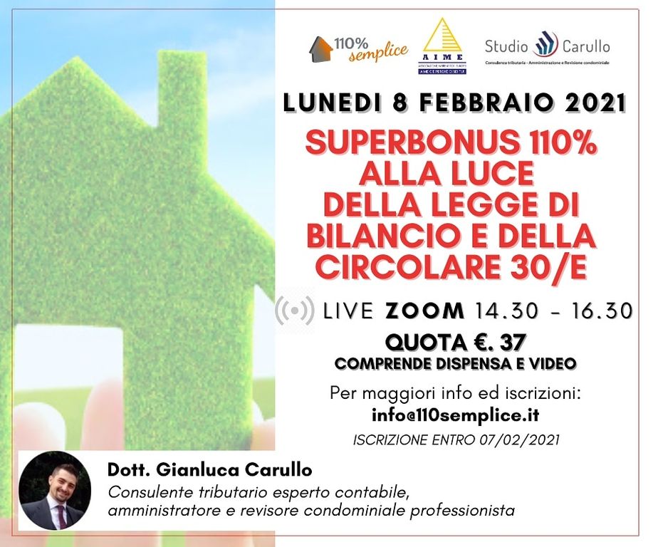 Per approfondire il tema, anche e soprattutto alla luce della legge di bilancio e della circolare 30/E, il team di esperti di "110% semplice" organizza in partnership con Aime e Studio Carullo un webinar: l'appuntamento è per lunedì 8 febbraio dalle 14.30 alle 16.30 sulla piattaforma Zoom. Il relatore sarà il dottor Gianluca Carullo, consulente tributario, esperto contabile, amministratore e revisore condominiale professionista.