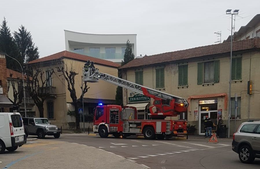 Alcuni passanti hanno chiesto l'intervento dei vigili del fuoco per un comignolo pericolante in via XXV Aprile. Era sul punto di cadere in un tratto di strada sempre molto traffico, dove ci sono anche diverse attività commerciali del quartiere.
