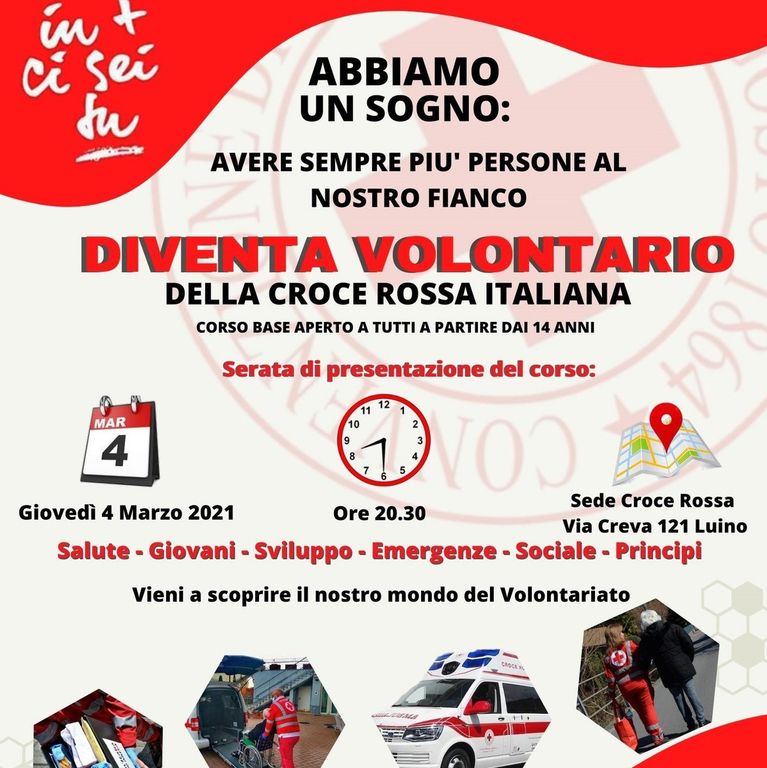 Il 10 marzo 2021 partirà il nuovo corso di accesso, del comitato di Luino e Valli, per diventare volontari della Croce Rossa Italiana; il corso della durata di circa un mese prevede una formazione iniziale di 28 ore, prevalentemente online, in orario serale, oltre a delle lezioni pratiche di primo soccorso. Alla fine del corso di accesso è previsto anche un tirocinio per conoscere sul campo le attività del Comitato.