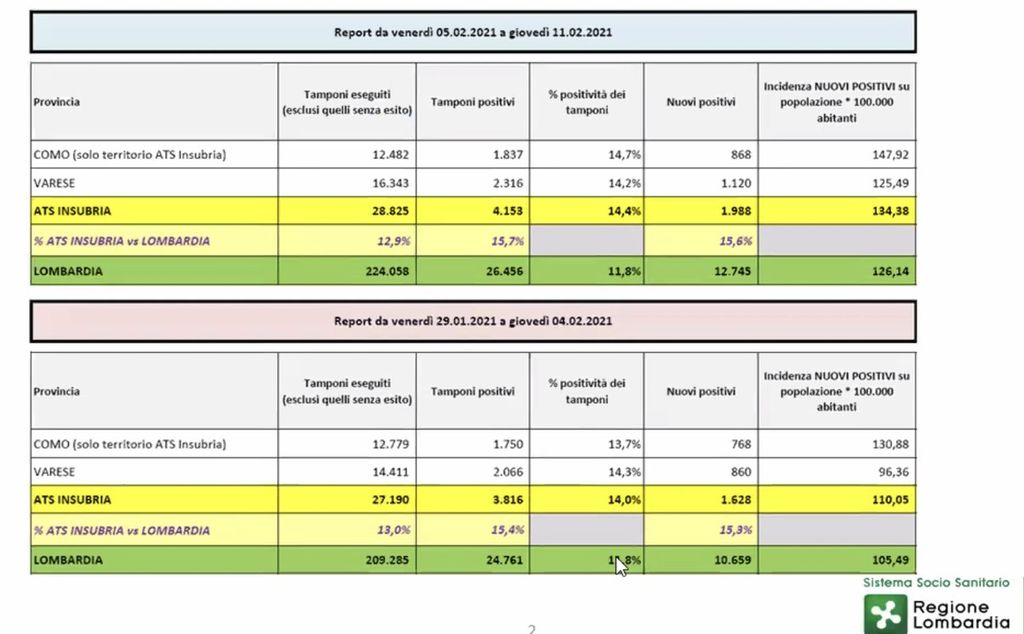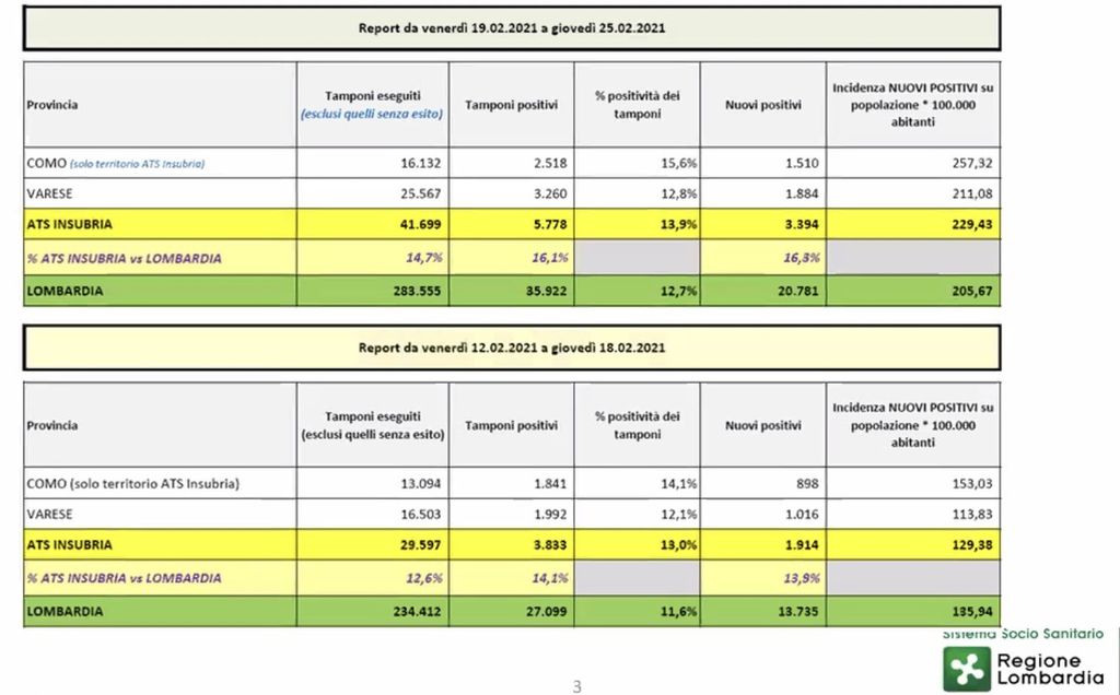 L'aumento dei casi è consistente: sul dato potrebbe incidere lo screening di massa fatto a Viggiù, ma non si tratta solo di questo. La curva sta risalendo in tutta la provincia. Nell'ultima settimana, quella compresa tra venerdì 19 febbraio e la giornata di oggi giovedì 25 febbraio, in provincia di Varese sono stati eseguiti 25.567 tamponi che hanno individuato 1.884 contagi con un'incidenza di 211,08 nuovi positivi ogni centomila abitanti. Nei sette giorni precedenti, quelli dal 12 al 18 febbraio, i tamponi erano stati 16.503 con 1.016 nuovi positivi e un'incidenza di 113,83. Un incremento intorno all'80%.
