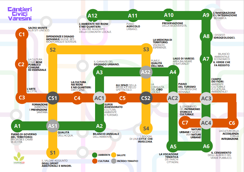 Per iniziare quindi i Cantieri Civici Varesini hanno identificato il perimetro nel quale costruire questi cantieri. «Lo abbiamo fatto, ovviamente, con la nostra sensibilità, con la nostra visione, con i nostri valori. Non precludiamo, in realtà, anche considerazioni che vadano al di là di questo perimetro, purchè aggiungano valore al percorso». E questo perimetro è fatto da tre parole chiave: Ambiente, Cultura e Salute, ma anche dalla intersezione tra di esse, per un totale di 31 temi sui quali discutere. «Questa fusione ci consente di poter davvero introdurre il concetto di Qualità della Vita nel suo significato più pieno».
