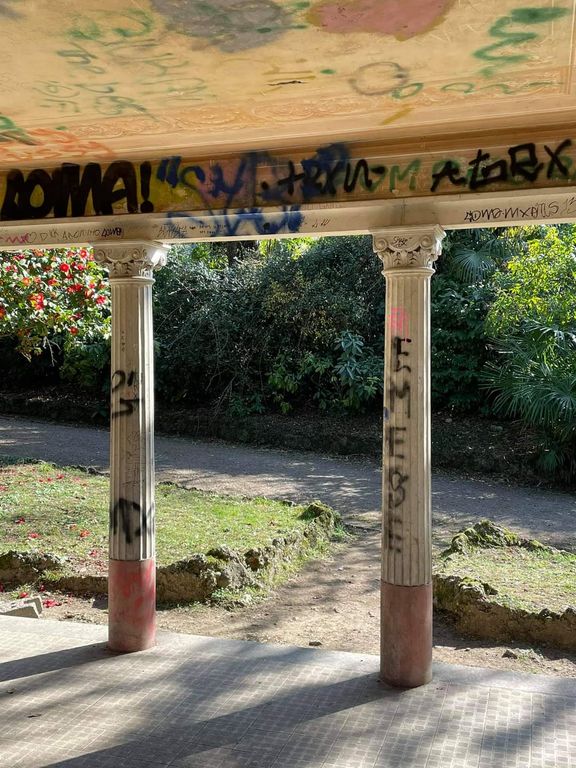 E mostrano la meravigliosa pergola in cemento del Parco completamente ricoperta da graffiti, tag, scritte e disegni volgari. Gli arredi urbani, come panchine e cestino, completamente distrutti e vandalizzati. Rami di alberi caduti e immondizia.