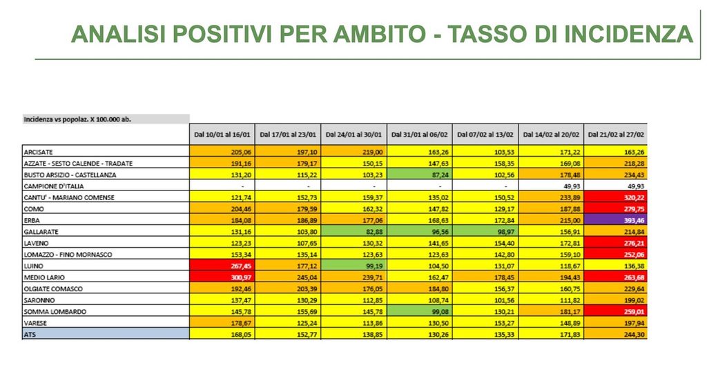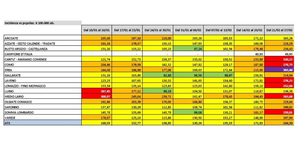 Tra i comuni principali il capoluogo è comunque quello messo meglio. Nel distretto di Saronno l'incidenza infatti è di 199,02, mentre a Gallarate il valore sale a 214,84 e a Busto Arsizio arriva a 234,43. Migliore la situazione a Luino, che riporta un'incidenza di 136,38, e ad Arcisate (163,26) mentre nel distretto di Laveno raggiunge 276,21. Supera la soglia limite anche il distretto di Somma, con un'incidenza a 259.
