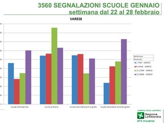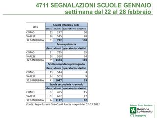 Per quanto riguarda scuole dell'infanzia/nidi nel Varesotto erano 28 le classi in quarantena, con 515 alunni e 88 operatori in isolamento fiduciario. La settimana precedente erano le classi erano 22, gli alunni 303 e gli operatori 45. Alle scuole primarie la situazione è questa: 28 classi in isolamento per 568 alunni e 64 operatori. Un miglioramento rispetto a sette giorni prima quando erano 34 le classi, 771 gli alunni e 86 gli operatori monitorati.