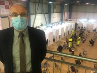 Normalmente abbiamo una quarantina di infermieri e una quindicina di medici, più una quarantina tra volontari, Protezione civile, Croce Rossa. Questo è il quantitativo giornaliero, per ora. Abbiamo organizzato a zone, perché intanto l’anziano viene accompagnato nei vari percorsi per arrivare al punto vaccinale pronto per fare la vaccinazione, con documenti e autorizzazione medica, senza attesa. Una volta che si entra nell’ambulatorio, si fa la vaccinazione, si consegna il certificato e ci si accomoda per 15 minuti necessari all’osservazione. Abbiamo anche offerto la possibilità di un maxischermo dove scorrono le immagini per mantenere l’attenzione su alcune abitudini come l’uso della mascherina o il lavarsi le mani.
