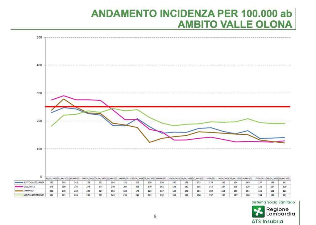 Nel basso Varesotto si consolida il forte calo in corso da un paio di settimane. Nell'ambito di Busto Arsizio - Castellanza l'incidenza al 19 aprile era di 141, in netta discesa rispetto ai 173 di sette giorni prima. Nell'ambito di Gallarate riduzione più contenuta, ma valori assoluti migliori: l'incidenza è a 129 contro i 138 della scorsa settimana.