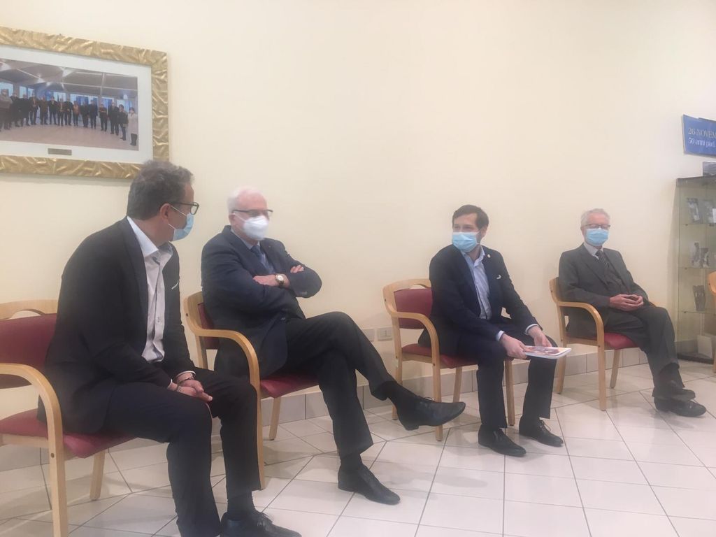 Mazzucchelli, con accanto il vice Angelo Guido Belloni, il direttore Luca Trama, il consigliere comunale Alessandro Albani: «Siamo un fiore all'occhiello, non ci abbandonate. Devo dire anche una cosa sui vaccini: l'ho fatto stamattina a MalpensaFiere e sono stato accolto con professionalità e cortesia».