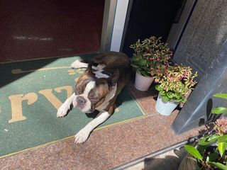 Spike è il boston terrier di Giovanni Corvi, il fratello di Ave, ed è accucciato sul tappetino all'entrata del negozio di fiori in corso Matteotti riaperto in questi giorni che, in attesa della festa della mamma, sono davvero molto intensi.