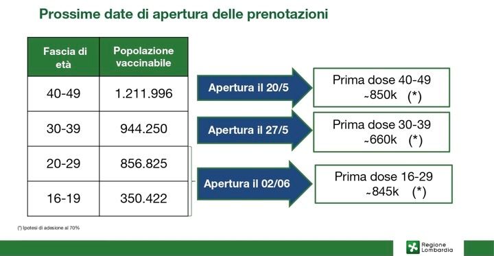 Apriranno giovedì 20 maggio le prenotazioni delle vaccinazioni anti-Covid per la fascia 40-49 anni con somministrazione dai primi di giugno. Il giovedì successivo (27 maggio) toccherà alla fascia 30-39 e, infine, il 2 giugno potranno prendere appuntamento anche tutti gli over 16. In questo modo, con un'ipotesi di 120.000 vaccinazioni al giorno, tutti i lombardi potranno ricevere la prima dose entro metà luglio.