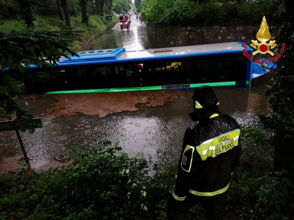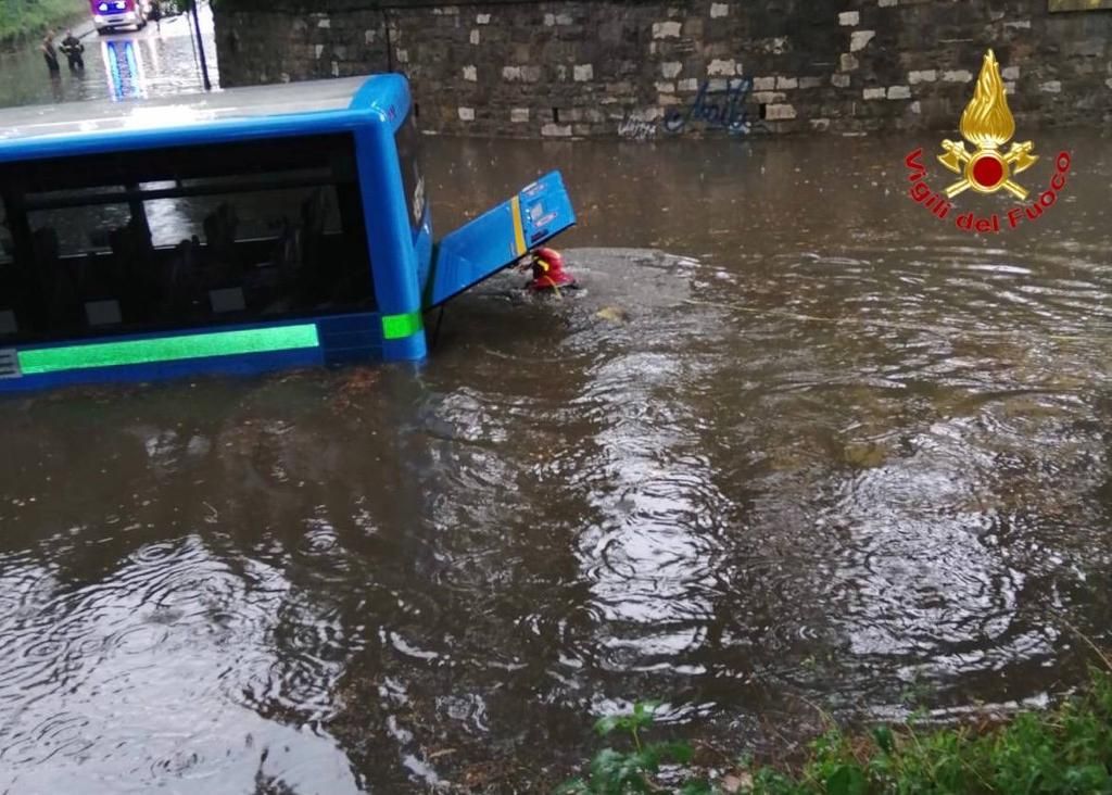 Il sottopasso va a mollo e resta intrappolato un pullman a Busto. Autista e cinque passeggeri vengono salvati dai vigili del fuoco. I quali devono intervenire con il gommone.