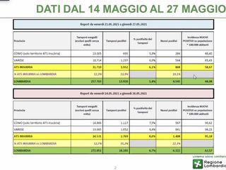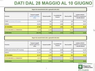 Partendo dai contagi il monitoraggio evidenzia come la crescita sia ancora in calo, con una riduzione di oltre il 30% di casi in una settimana. In provincia di Varese dal 4 giugno a oggi sono stati analizzati 16.432 tamponi, che hanno individuato 237 nuovi positivi. Nei sette giorni precedenti i tamponi erano stati 15.342 con 376 casi individuati.