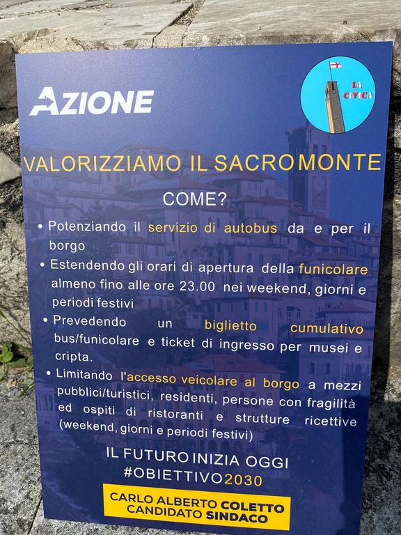 «Proponiamo la personalizzazione del Sacro Monte nei weekend utilizzando autobus e navette incrementati o salendo a piedi - spiega Coletto - tranne ovviamente per chi ha prenotazioni nelle strutture ricettive e nei ristoranti del Borgo. Proporremo la nostra petizione, per cui inizieremo a raccogliere le firme da domani nei banchetti posizionati in città, a chiunque vincerà le elezioni e al consiglio comunale».