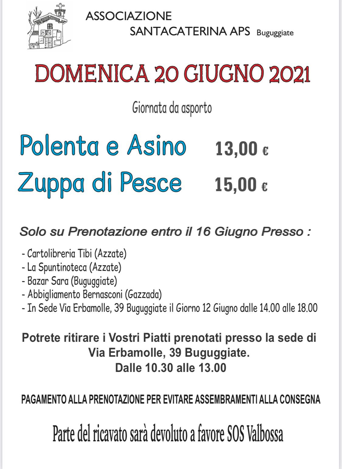I piatti andranno ritirati nella sede dell’associazione Santa Caterina in via Erbamolle 39 a Buguggiate dalle 10.30 alle 13.00 di domenica 20 giugno! Buon appetito, golosoni!