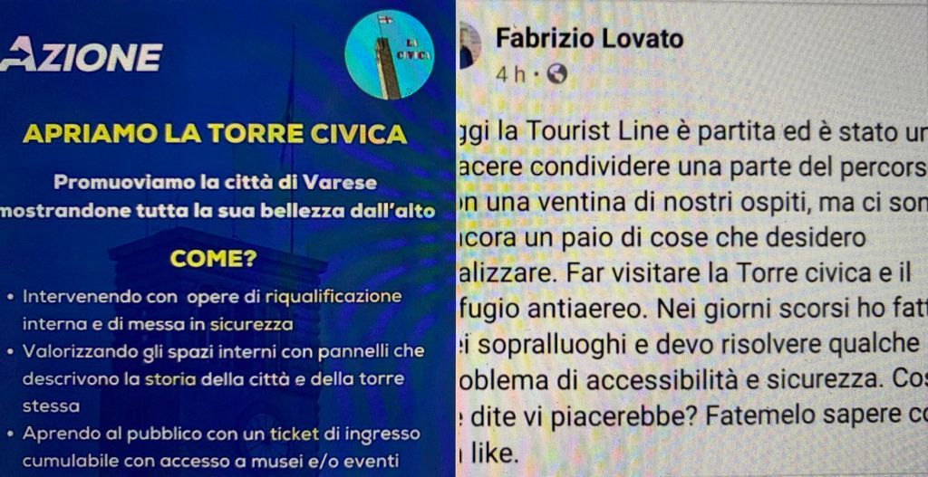 «Improvvisamente l’assessore Lovato ci stupisce e scrive in un suo post su facebook pubblicato qualche ora fa, che vorrebbe aprire la Torre Civica e chiede ai cittadini se a loro piacerebbe l’idea...»: inizia così l'intervento di Mauro Gregori de La Civica che venerdì ha presentato con Azione e il candidato sindaco Carlo Alberto Coletto (leggi QUI) una petizione proprio per fare in modo che tutti i cittadini possano salire sulla Torre Civica e ammirare Varese dall'alto.