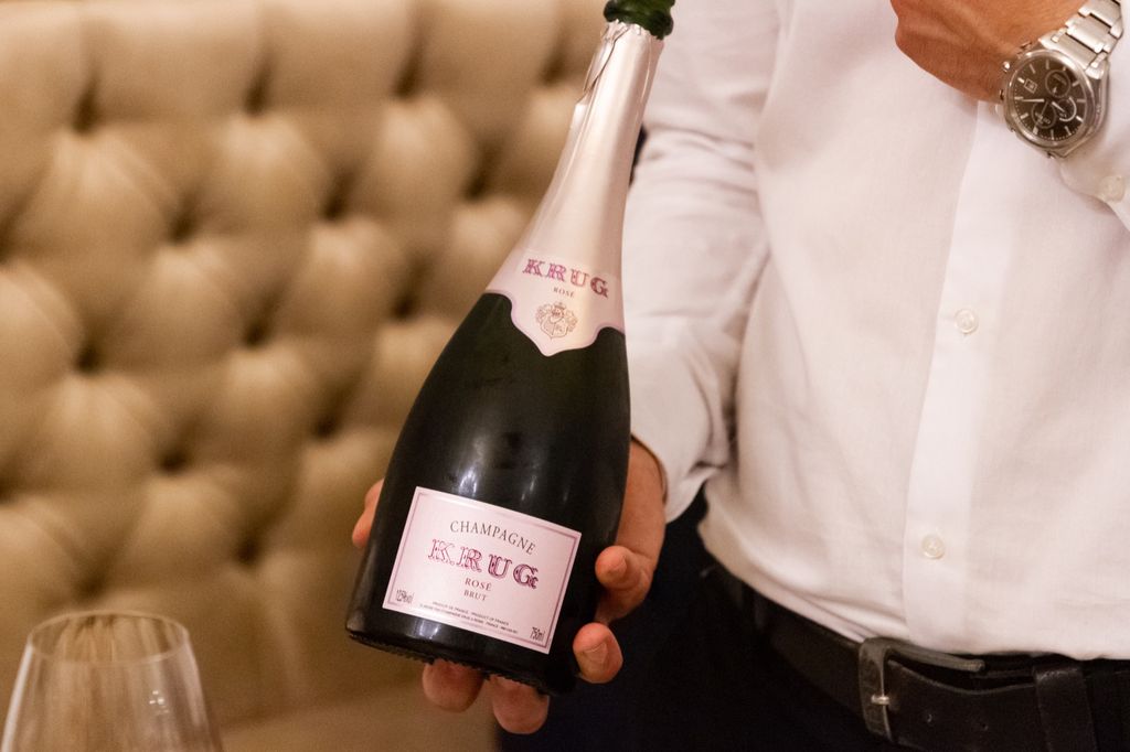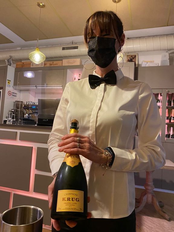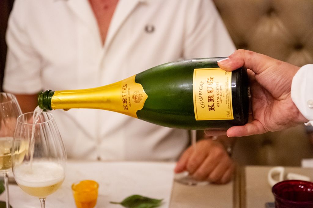 Dopo un affascinante viaggio in Francia, nella terra di quelle bollicine che ama tanto lo chef padrone di casa, e un primo sublime assaggio di questa perla che è il Krug, le danze culinarie sono state aperte giocando in casa, con la magnifica e gustosissima pizza della pace, da tagliare rigorosamente con la forbice, e da gustare abbinata a due tipologie di mozzarelle di bufala che ne esaltano i sapori.