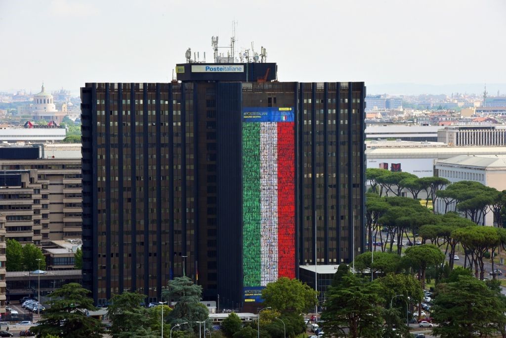 La maxi-bandiera ricopre interamente la facciata dell’edifico che ospita la sede centrale di Poste Italiane a Roma e riporta il volto di migliaia di dipendenti dell’azienda che hanno partecipato all’iniziativa #Posteitaliani, inviando la propria foto e ‘mettendoci la faccia’ per incoraggiare i ragazzi di Mister Roberto Mancini.