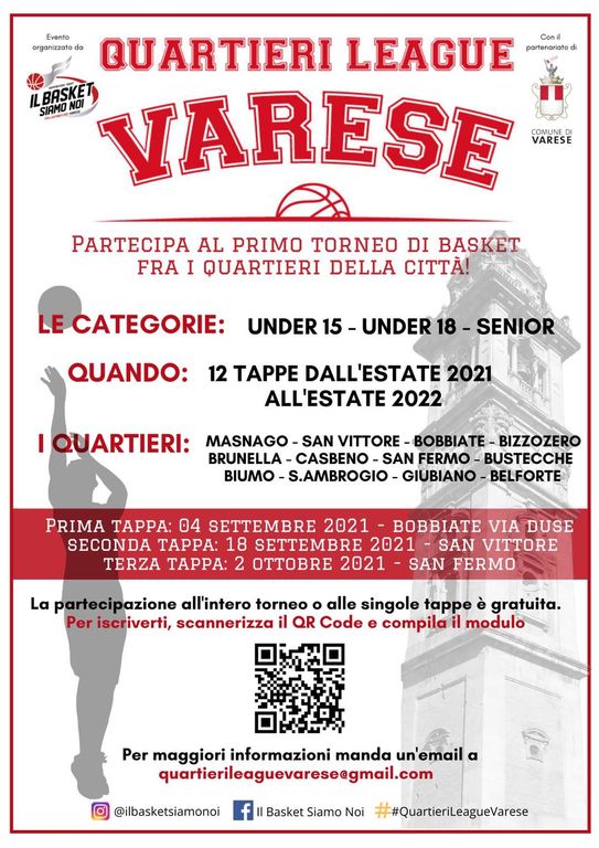 La parte sportiva è un’idea che esalterà la voglia di scendere in campo di giovani e meno giovani amanti della palla a spicchi cittadina, con l’onore di rappresentare il proprio quartiere. Ci saranno 12 tappe dall’estate 2021 alla prossima, nei campi di Masnago, San Vittore, Bobbiate, Bizzozzero, Brunella, Casbeno, San Fermo, Bustecche, Biumo, Sant’Ambrogio, Giubiano, Belforte. Si partirà il 4 settembre dal campo di Via Duse, a Bobbiate e si proseguirà il 18 settembre all’oratorio San Vittore.