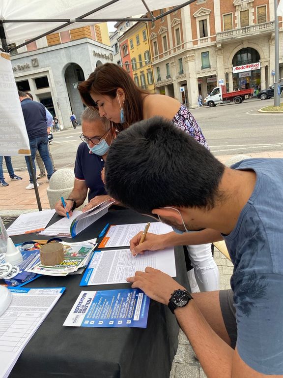 Isabella Tovaglieri, europarlamentare della Lega, è stata tra i primi ad arrivare in piazza Monte Grappa per inaugurare la raccolta firme sui sei quesiti referendari relativi alla giustizia lanciati da Matteo Salvini e poi per abbracciare Matteo Bianchi (foto in alto) che ha iniziato oggi la campagna elettorale come candidato sindaco del centrodestra (leggi QUI le parole di Giorgetti). Erano già un centinaio, a metà giornata, i cittadini che avevano aderito ai quesiti referendari leghisti, firmando al gazebo.