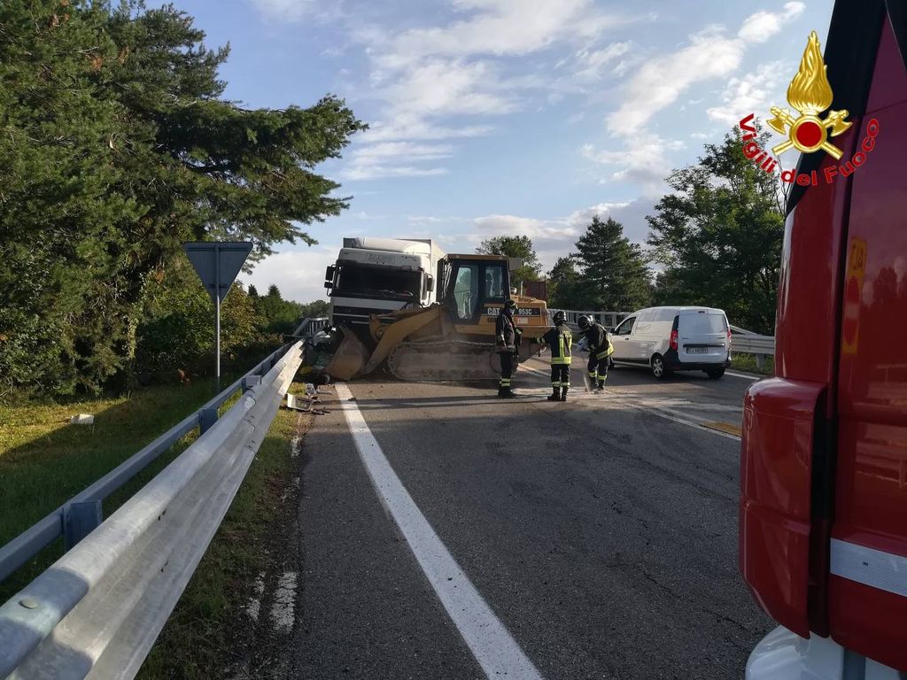 FOTO. Mezzo pesante "perde" ruspa in autostrada: schianto con un altro camion sul raccordo A8/A26