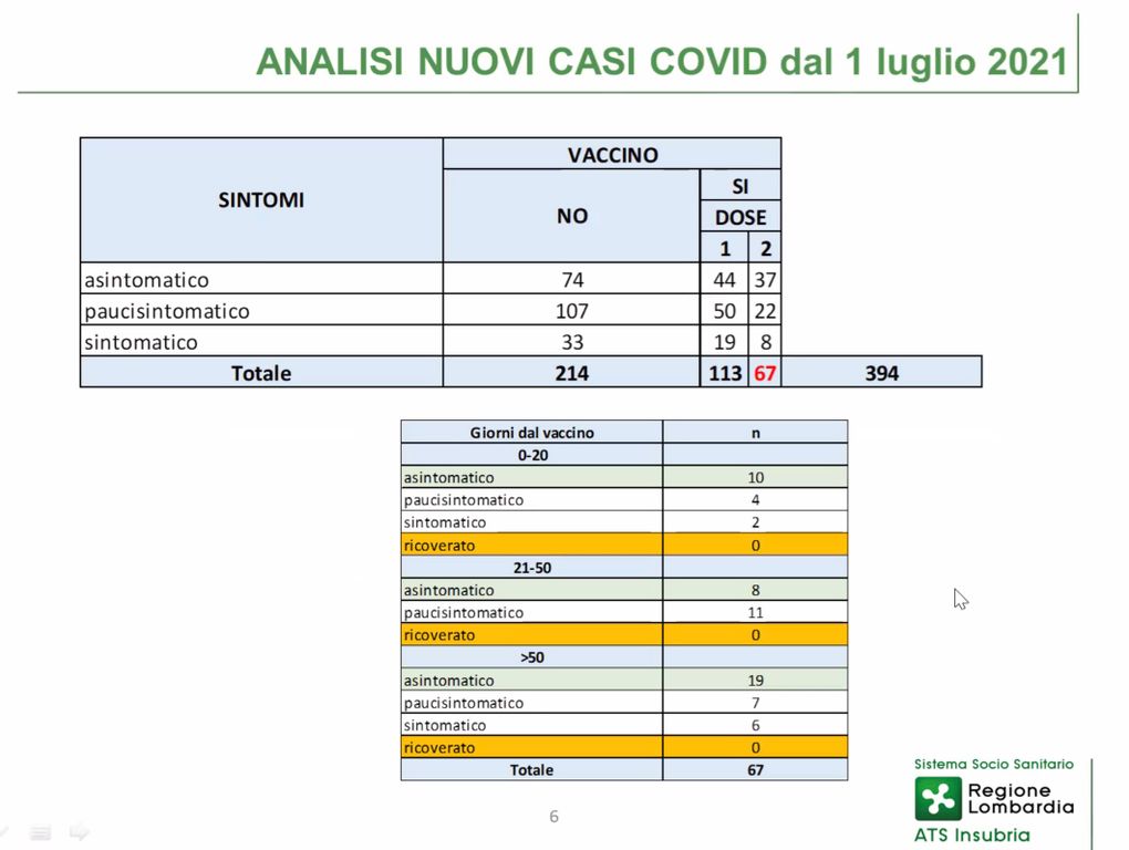 Anche perché il vaccino evita conseguenze gravi della malattia. Anche qui parlano i numeri: dal 1° luglio Ats Insubria sul proprio territorio (le province di Varese e di Como) ha individuato 394 nuovi positivi. Di questi 214 non erano vaccinati, mentre 180 avevano già ricevuto il siero. Tra loro 64 avevano completato il ciclo vaccinale e di questi solo 8 avevano sintomi, nessuno dei quali di gravità tale da comportare un ricovero. Tra questi numeri i laboratori hanno individuato una trentina di casi di variante Delta, percentuale però secondo gli esperti destinata a salire con il proseguo delle analisi.