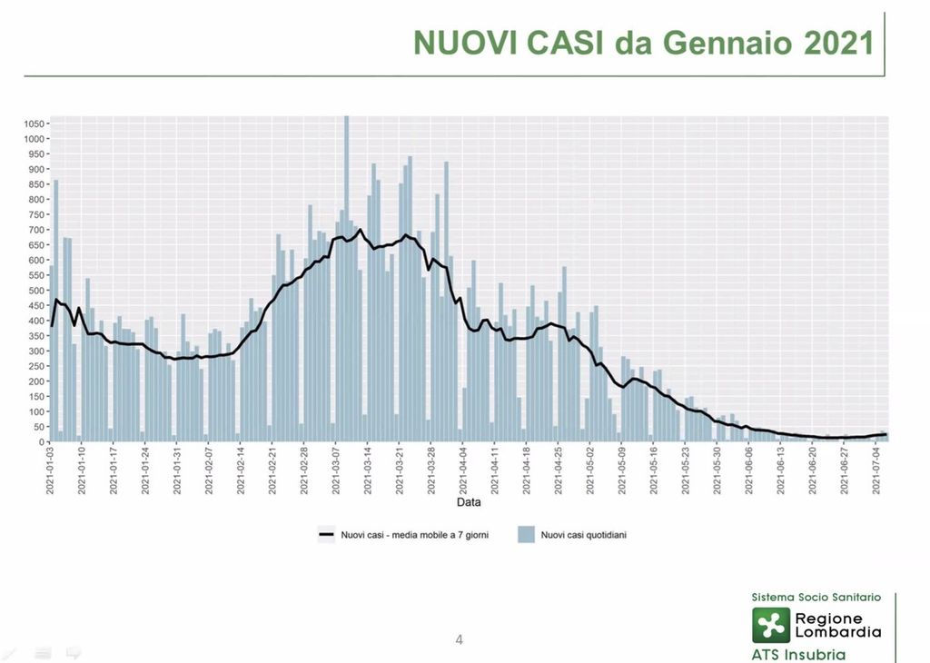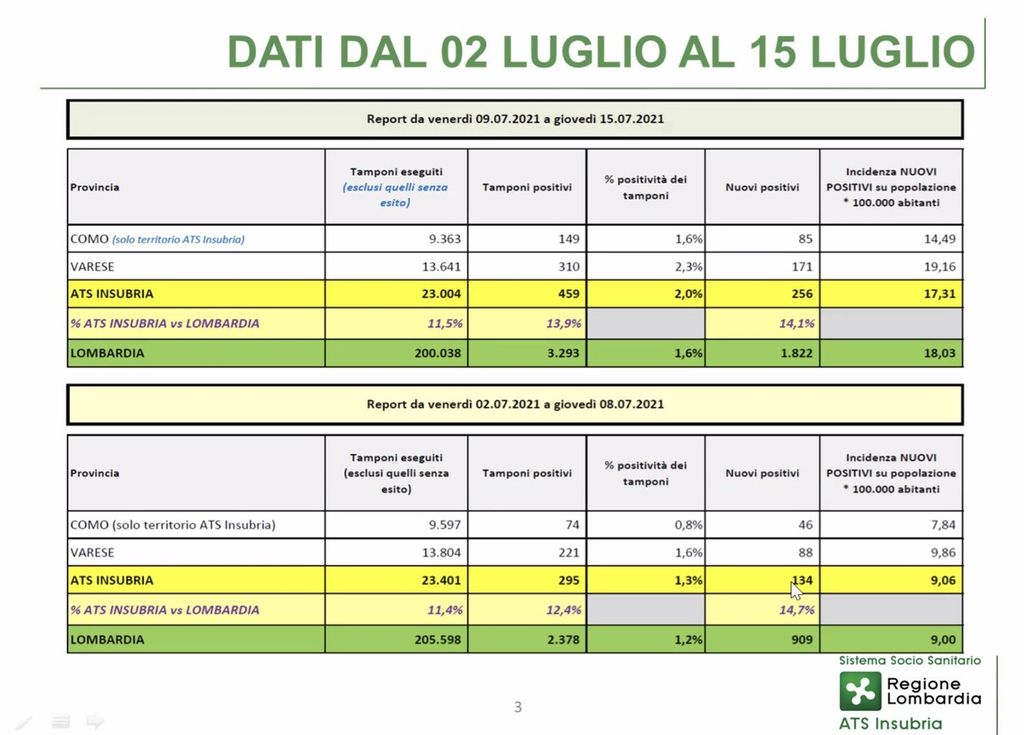 In provincia di Varese nell'ultima settimana, quella tra il 9 luglio e oggi, sono stati infatti accertati 171 nuovi positivi su una base di 13.641 tamponi (incidenza di 19,16 nuovi casi ogni centomila abitanti). Nei sette giorni precedenti, dal 2 all'8 luglio, erano stati 88 i nuovi positivi individuati da pressoché lo stesso numero di tamponi (13.804, per un'incidenza al 9,06): nella settimana precedente l'andamento era sostanzialmente stabile.