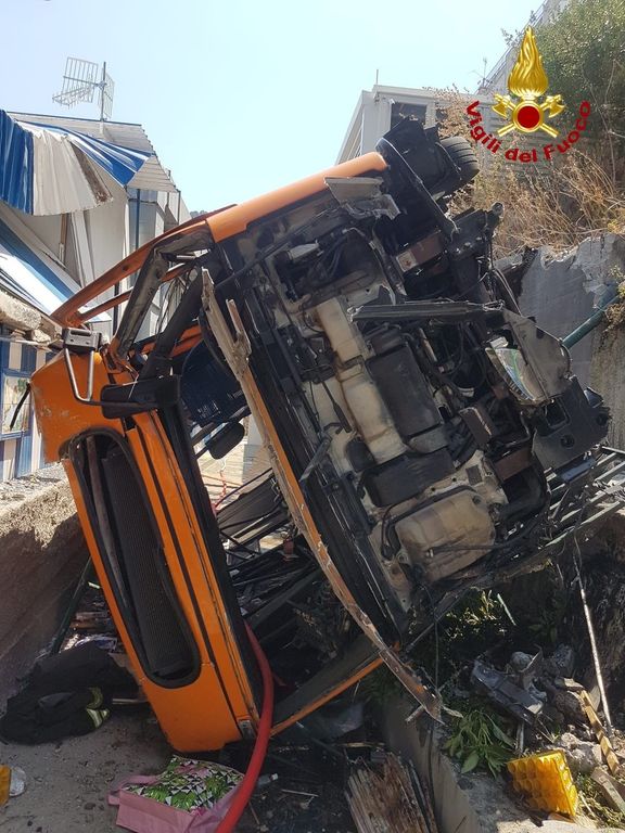 Sono impressionanti le immagini dell'incidente avvenuto in tarda mattinata a Capri, dove un autobus è uscito di strada precipitando nei pressi del lido "Le Ondine" di Marina Grande. Il conducente del veicolo è morto mentre sono 28 le persone ferite, trasportate al pronto soccorso di Capri. Alcuni di loro sono in gravi condizioni: in particolare due di loro sono stati trasferiti in elicottero a Napoli. Un volo di 5-6 metri piombato tra i bagnanti in una tranquilla mattinata di estate al mare. Ecco le immagini rese pubbliche dai vigili del fuoco.