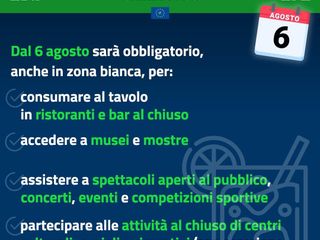La decisione del Governo Italiano è arrivata: dal 6 agosto il Green Pass sarà obbligatorio per le persone sopra i 12 anni in ordine allo svolgimento di talune attività.