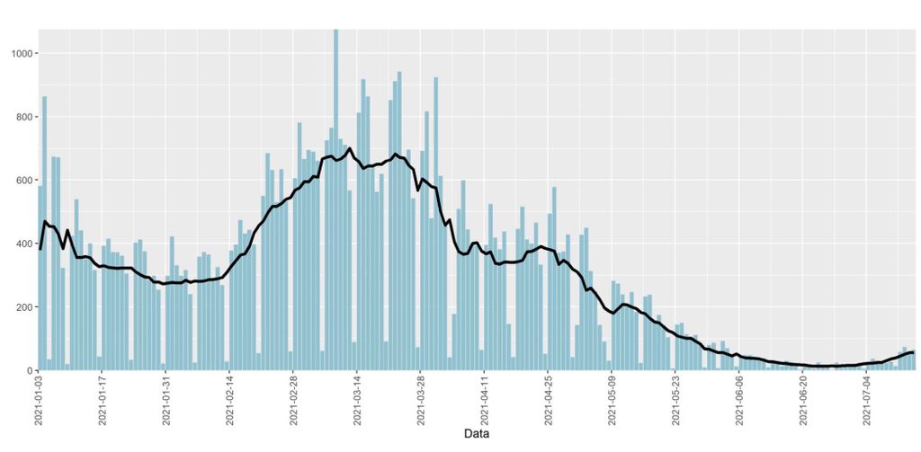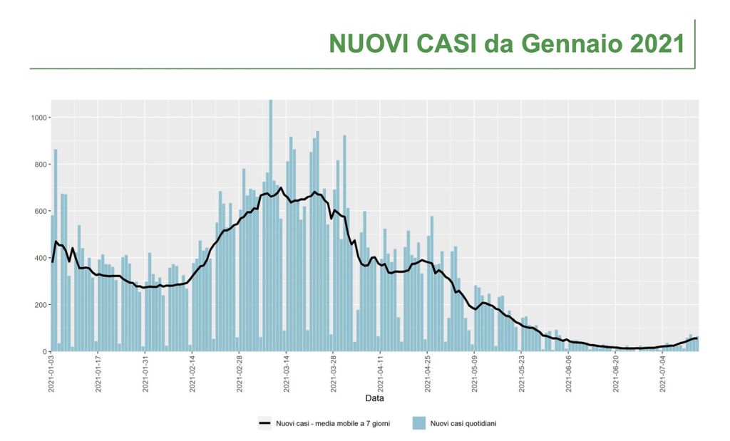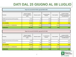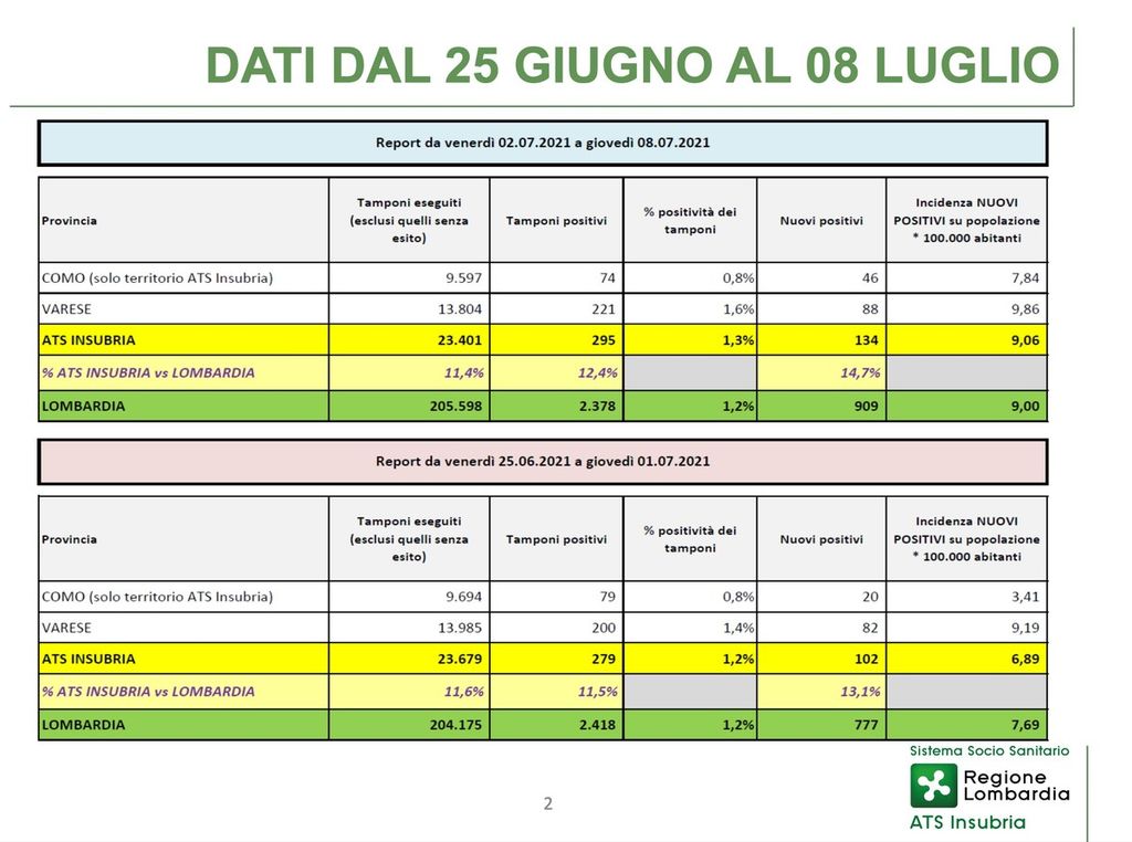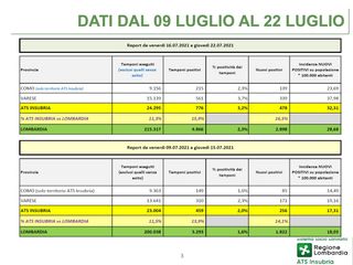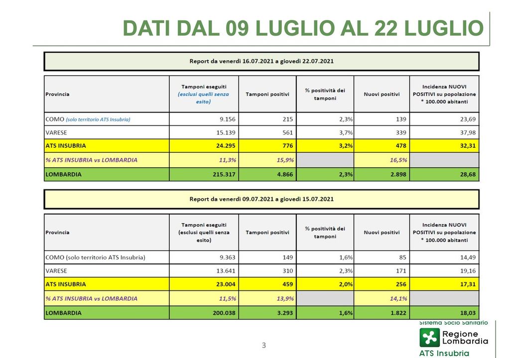 Nell'ultima settimana, quella compresa tra venerdì 16 e oggi giovedì 22 luglio, i nuovi positivi accertati dall'Agenzia di tutela della salute in provincia di Varese sono stati 339 su una base di 15.139 tamponi eseguiti (incidenza di casi ogni centomila abitanti di 37,98). Nei sette giorni precedenti, dal 9 al 15 luglio, i casi erano stati circa la metà: 171 su 13.641 tamponi (incidenza 19,16).