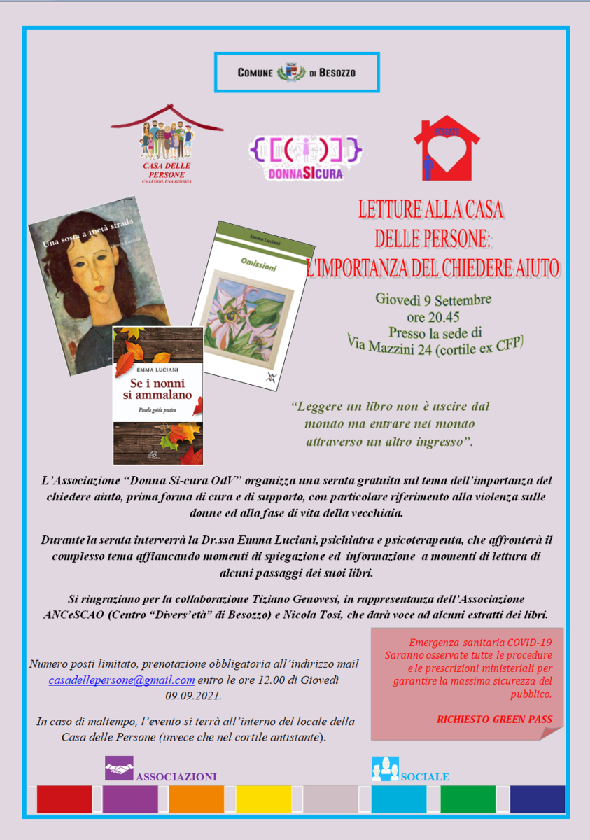 Aiutare e sostenere le donne che hanno subìto violenza. Questa è la missione di Donna Si-Cura OdV, associazione di Travedona Monate che, giovedì 9 settembre, farà da madrina a Letture alla Casa delle Persone: l’importanza del chiedere aiuto, progetto nato a luglio da Francesca Pianese, Consigliere Comunale di Besozzo, e Nicola Tosi, attore e regista varesino, dopo una serata di lettura di poesie e condivisione di progetti (in basso, alla voce "Files", la locandina in .pdf).