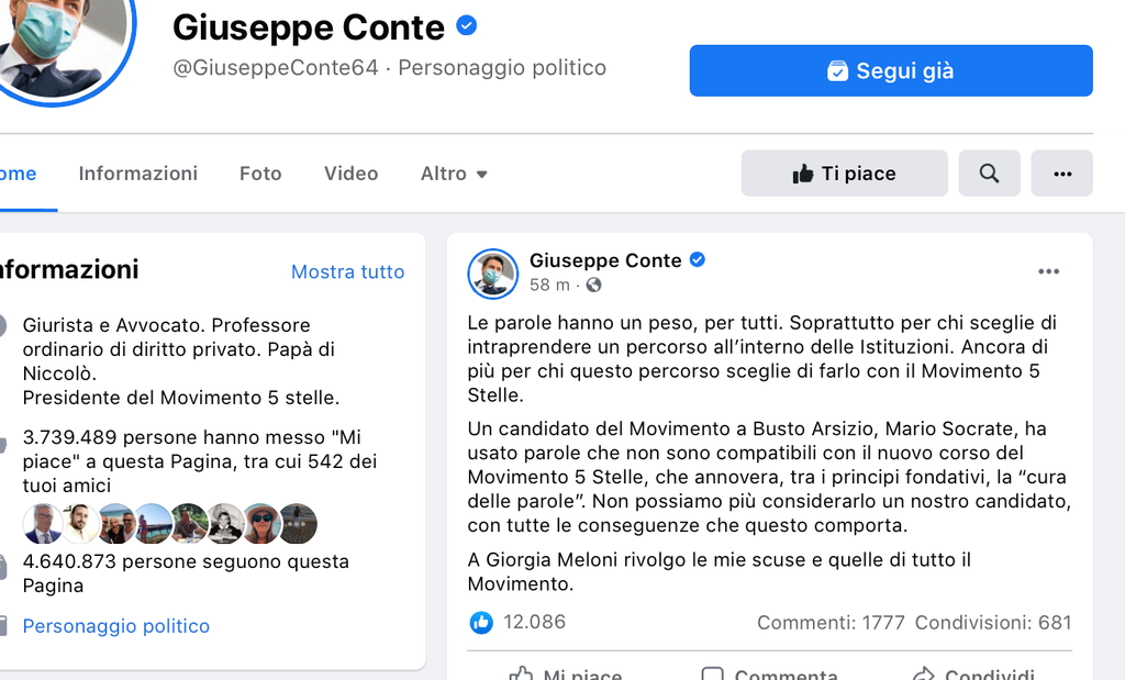 La giornata convulsa si conclude così con un post di Conte (tra l'altro in arrivo giovedì sera a Busto Arsizio): «Le parole hanno un peso, per tutti. Soprattutto per chi sceglie di intraprendere un percorso all’interno delle Istituzioni. Ancora di più per chi questo percorso sceglie di farlo con il Movimento 5 Stelle. Un candidato del Movimento a Busto Arsizio, Mario Socrate, ha usato parole che non sono compatibili con il nuovo corso del Movimento 5 Stelle, che annovera, tra i principi fondativi, la “cura delle parole”».