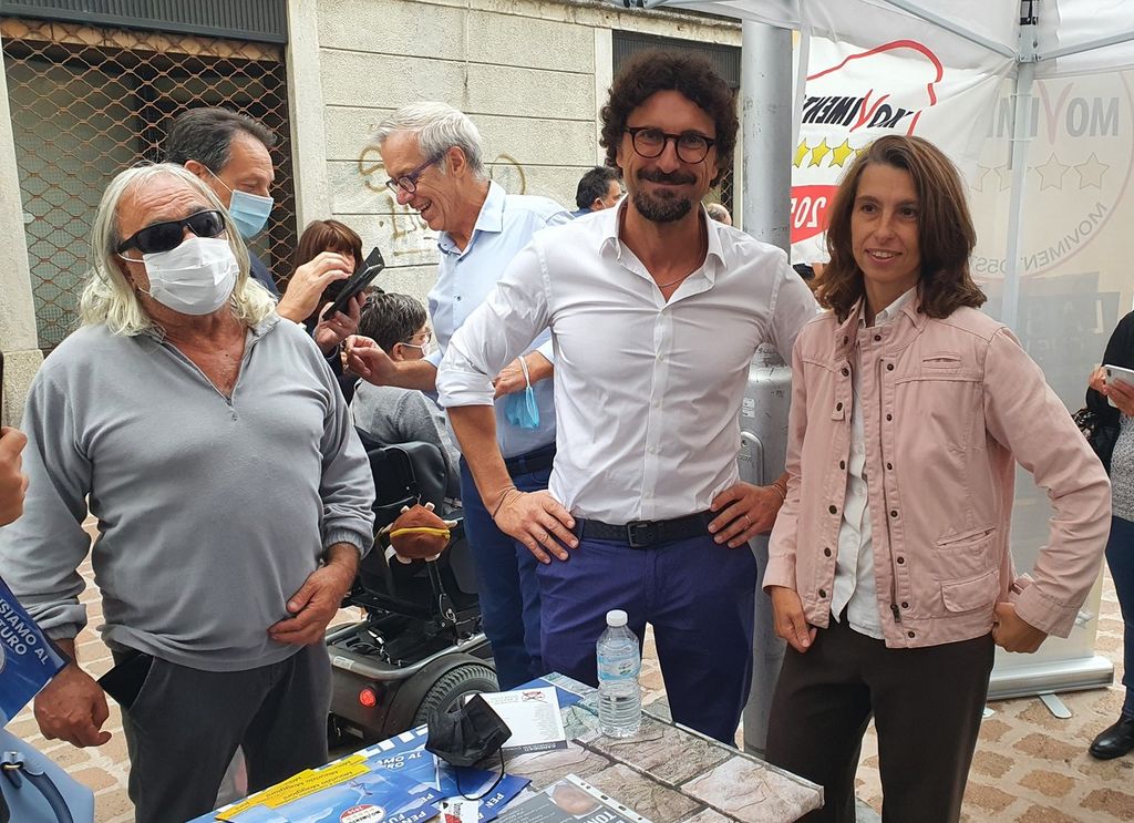 Prima di raggiungere il gazebo in via Milano insieme al consigliere regionale Roberto Cenci, Toninelli si è recato davanti al grattacielo di piazza San Michele dove, ha detto, «è in corso una ristrutturazione accelerata dalla norma del Superbonus 110 per cento. Alla base della ripresa economica c’è anche questo, ed è merito del Movimento 5 Stelle e del governo Conte 2».