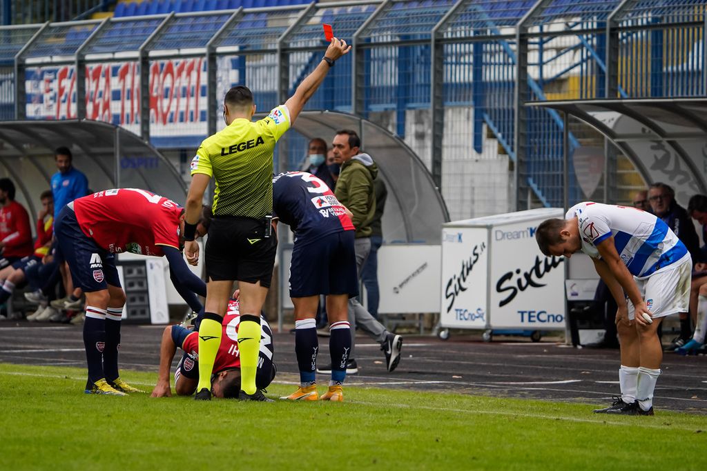 Nella ripresa più ammonizioni che azioni, con un po' di nebbia arbitrale, finché Banfi viene espulso. Pro Patria dunque in dieci dall’82’ ma poco male, perché riesce a gestire la situazione. Al 68’ Prina aveva inserito Galli e Ghioldi al posto di Nicco e Stanzani; deve operare una doppia sostituzione anche di Pierozzi e Bertoni con Vezzoni e Colombo neanche un quarto d’ora dopo.
