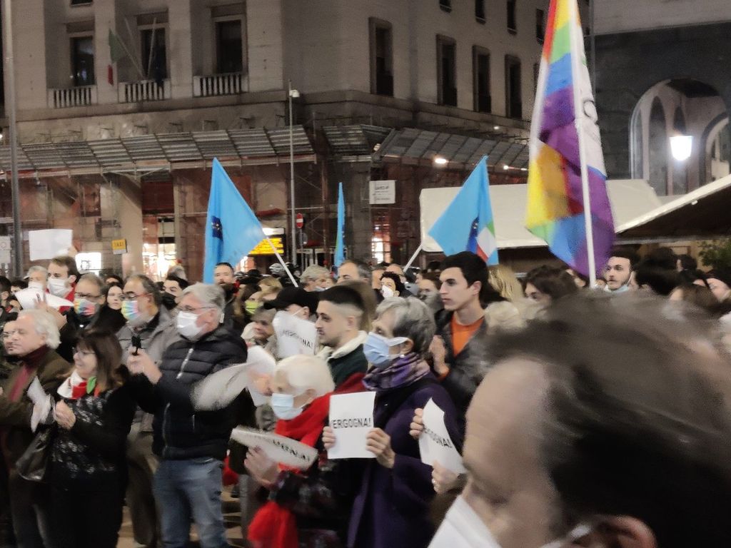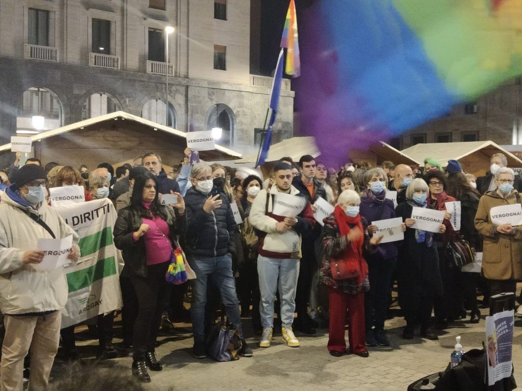 Un cartello bianco e nudo dietro al quale le facce si vedevano benissimo e sul quale c'è scritto "vergogna", una parola poi urlata dalle tante persone - almeno 200 - presenti in piazza Monte Grappa, è stato alzato per concludere la manifestazione indetta da associazioni e sindacati per protestare contro chi, «senza metterci la faccia come noi e come tutte le persone che rappresentiamo», ha affossato - «anche con l'aiuto delle forze che avevano detto di sostenerci» - il ddl Zan, lasciando l'Italia tra gli «sparuti Paesi europei senza una legge che tuteli con una legge le persone contro la discriminazione e la violenza per motivi fondati su sesso, genere e disabilità».