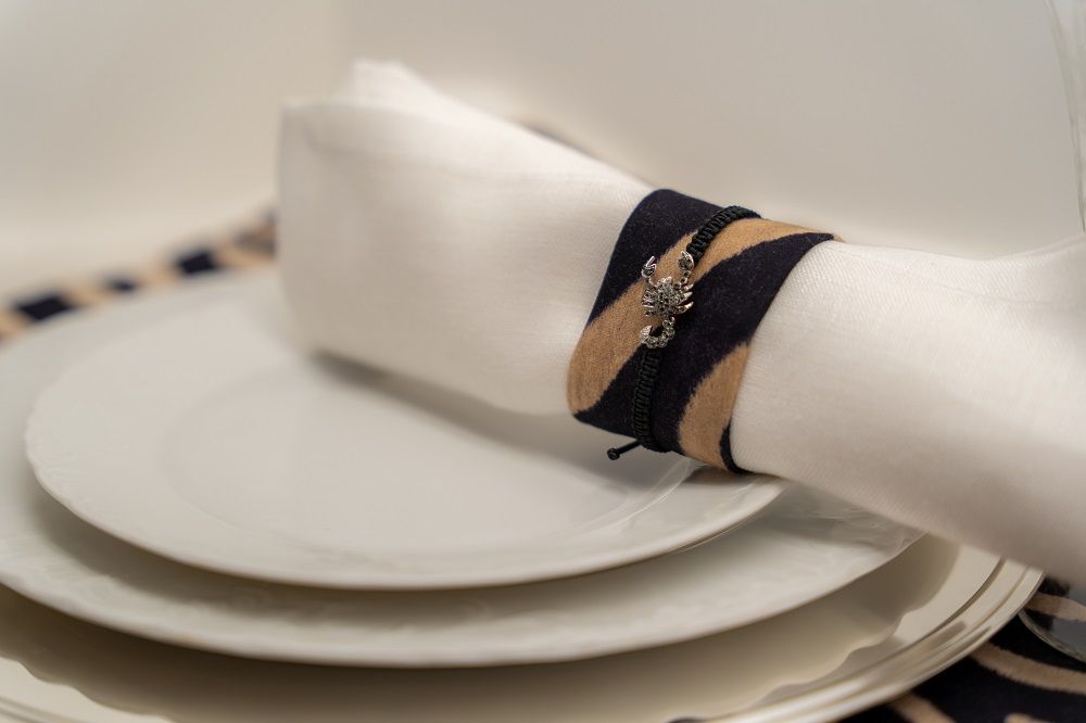 “Stiamo lanciando in questi giorni una linea di tovaglie, tovaglioli e oggetti per la tavola come segnaposto, portatovaglioli, vasi e candele coordinati e abbinati a gioielli, pietre preziose e charm che gli ospiti possono staccare e tenere per sé, come cadeau”, spiega Milena Bernocco. “Si tratta di una nuova proposta che realizzeremo sempre in ottica custom made in base alle richieste dei clienti”.