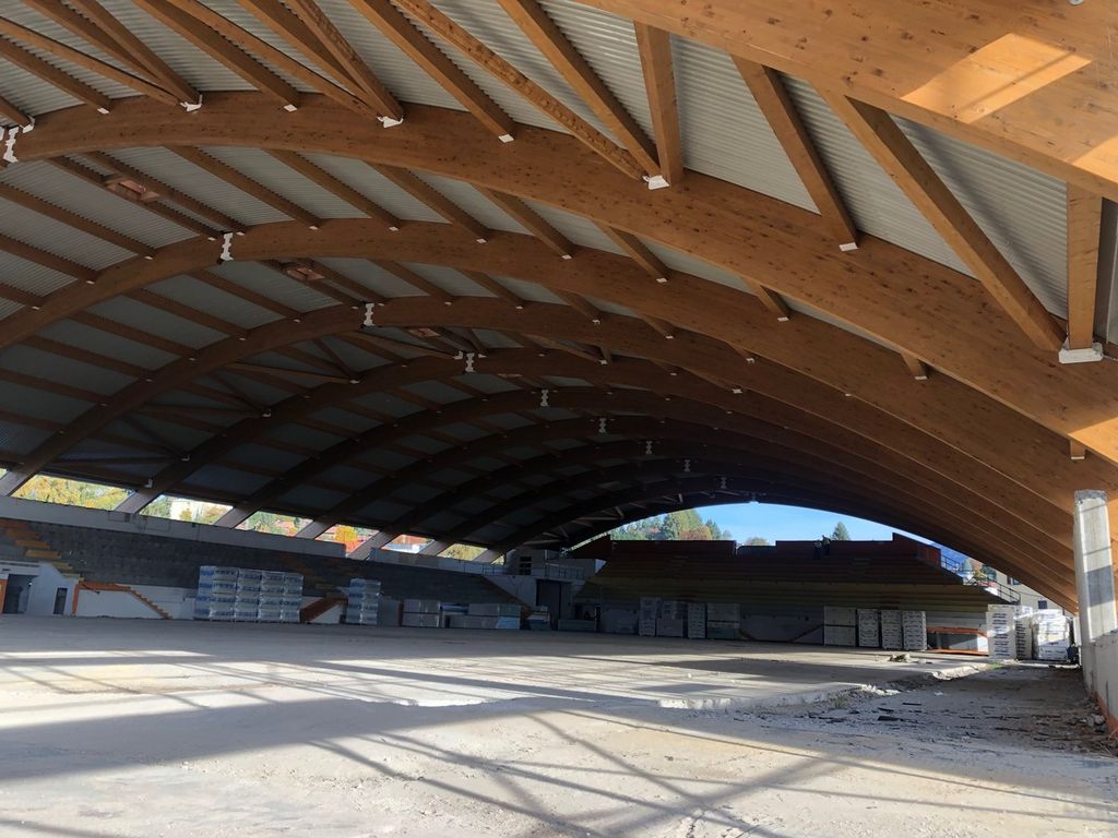 E' stato posato il manto di copertura sugli archi del nuovo Palaghiaccio di Varese. Si tratta di un materiale in lamiera grecata ad alto isolamento termico, che va in tal modo a coprire la struttura formata da diciotto archi, di cui sedici nuovi in legno lamellare e due di recupero dal vecchio impianto.