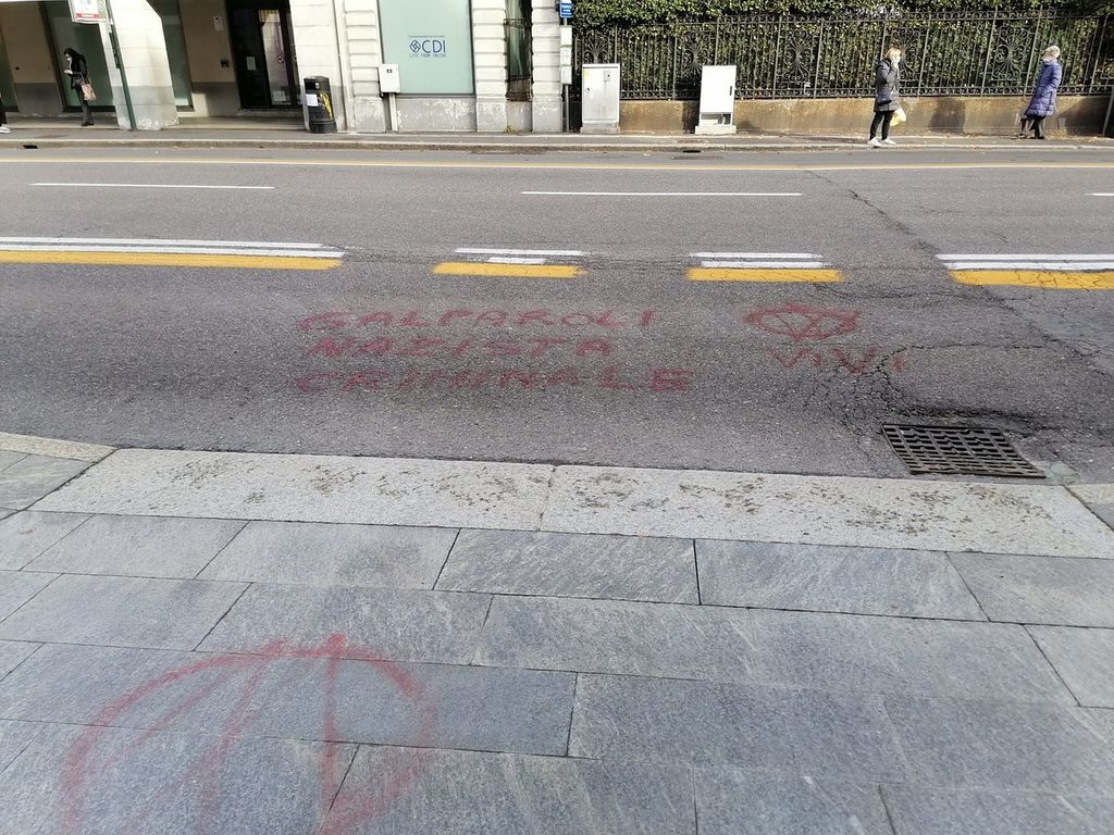 Scritte contro l'ex consigliere comunale di Forza Italia Piero Galparoli, ora responsabile degli enti locali di Fi, davanti a Palazzo Estense. Sono comparse questa mattina, tracciate con della vernice spray rossa sull'asfalto: "Galparoli nazista criminale", il tutto accompagnato da alcuni cartelli a firma "ViVi" che riportano anche la frase a pennarello "I vaccini uccidono".