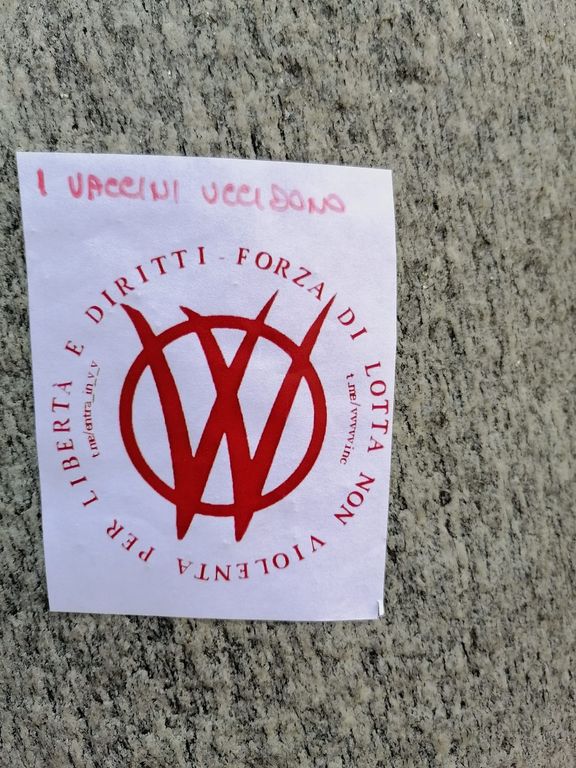 Sempre questa mattina alcune scritte no vax sono apparse sulle pareti esterne dell'ex Aermacchi, questa volta tracciate con vernice azzurra, in via Crispi e in via Castoldi (leggi QUI).