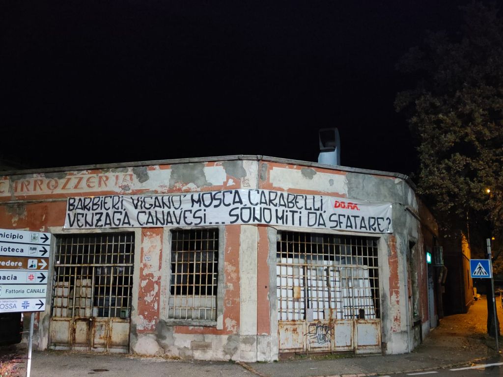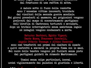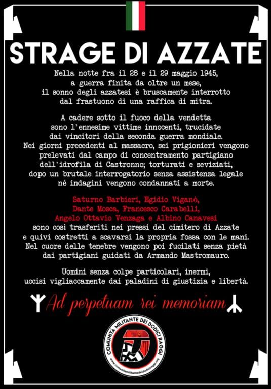 La protesta è durata giusto il tempo di appendere tre striscioni di contestazione in paese, prima che la polizia li bloccasse. Due messaggi diretti all’autrice, uno riportava invece i cognomi degli uomini fucilati ad Azzate nella notte tra il 28 e il 29 maggio del 1945.