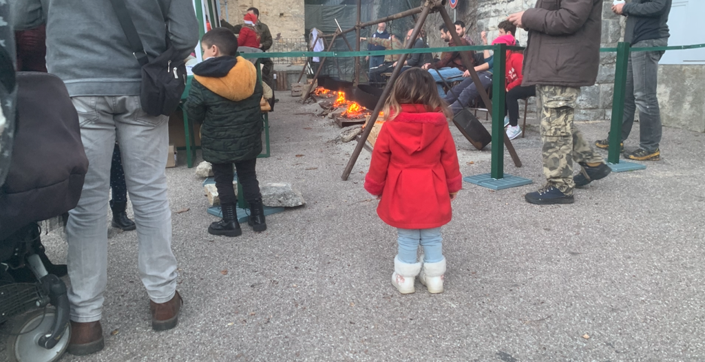 C’è profumo di bomboloni alla crema, poi di polenta, infine di salsiccia che sfrigola sulla griglia: siamo giunti alla piazzetta della chiesa, davanti al bar Bianchi. Qui l’ultima immagine ha lo stupore di una bimba che guarda estasiata i ragazzi che fanno saltare le caldarroste dentro alle padelle. Ci abbassiamo ai suoi settanta centimetri scarsi di frugoletta: ha ragione lei, da qui è tutta un’altra prospettiva.