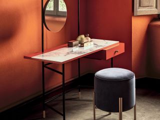Vanity può essere utilizzato in camera da letto come angolo di beauty routine. Possiede un cassettino laterale, uno specchio rotondo ed un punto luce. Il marmo sulla superficie d’appoggio è un tocco di raffinatezza aggiunta. Vanity è sicuramente uno dei più bei scrittoi di design da posizionare in casa.