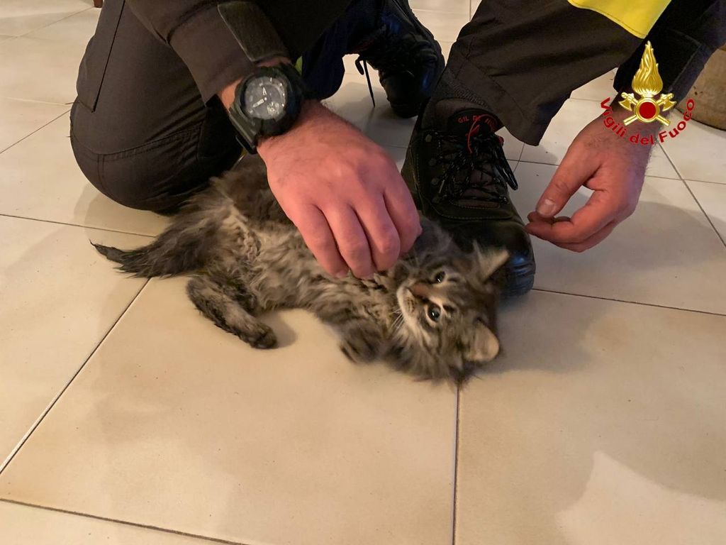Gatto intrappolato in un condotto fognario e salvato dai vigili del fuoco. E' successo oggi intorno a mezzogiorno a Cittiglio, in via Vittorio Veneto.